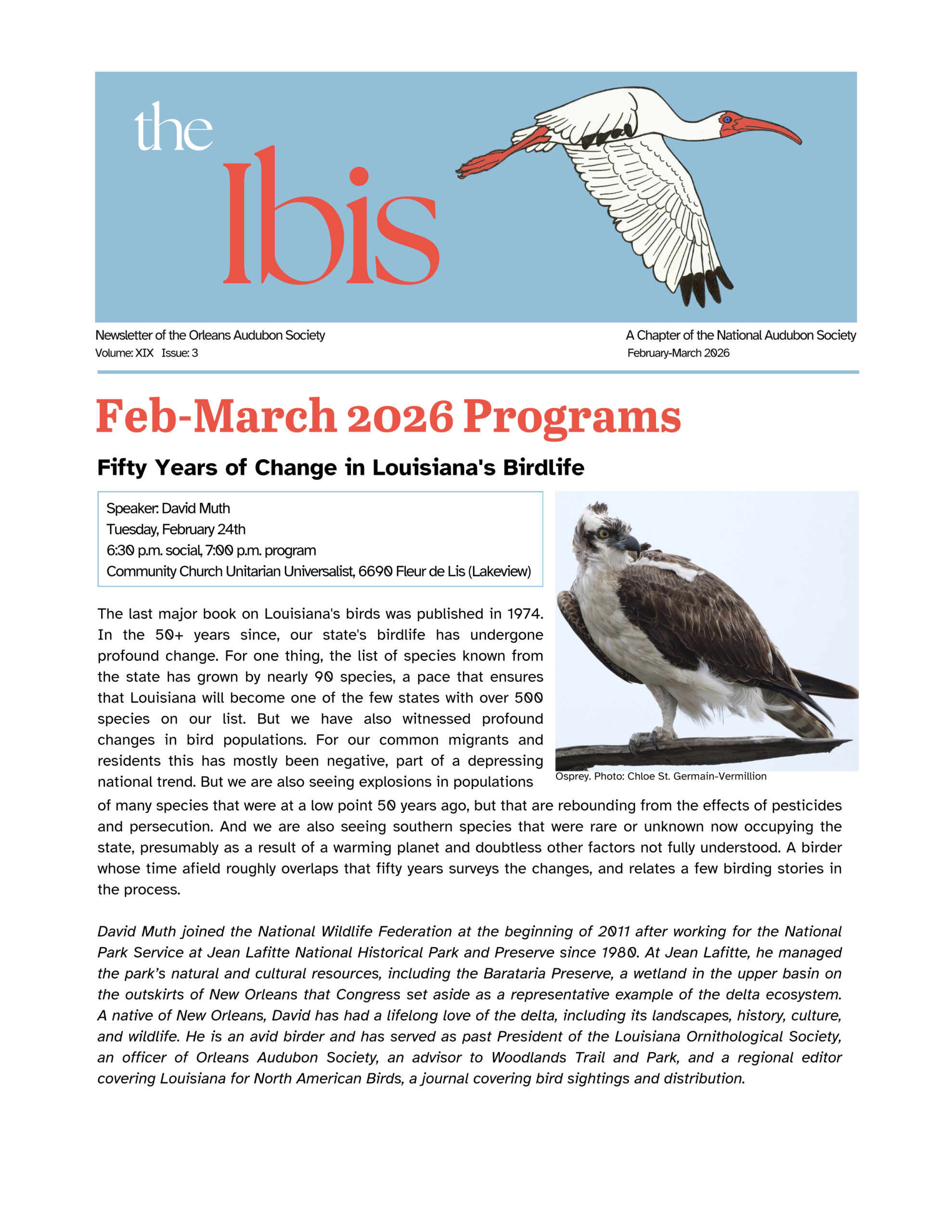 The Ibis February-March 2026 Click here to download the February-March 2026 issue of the Orleans Audubon Society’s newsletter.